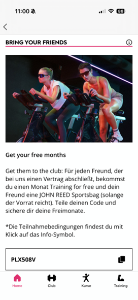 - Share your personal Code or Link – dein Freund muss diesen beim Vertragsabschluss online oder im Club angeben. Nur so erhaltet ihr eure Prämien.